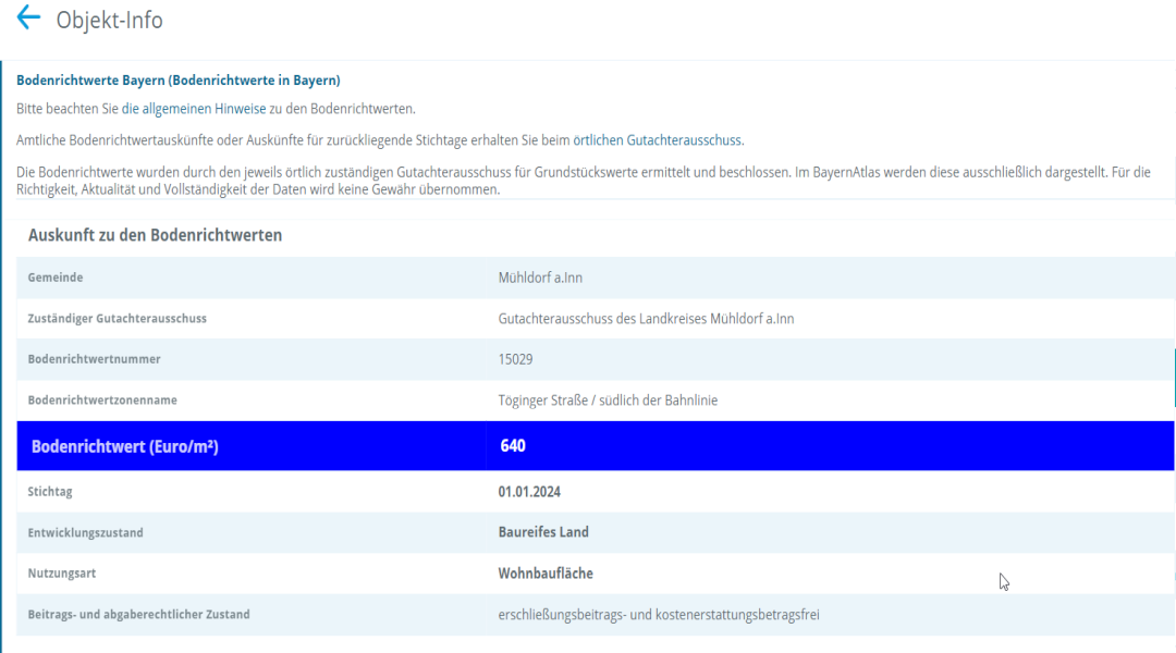 Zukünftig ist geplant, auch die textlichen „Erläuterungen zu den Bodenrichtwerten“ der Gutachterausschüsse über Verlinkungen in die Objektinfo aufzunehmen. Für den Landkreis Landshut ist dies bereits probeweise umgesetzt.